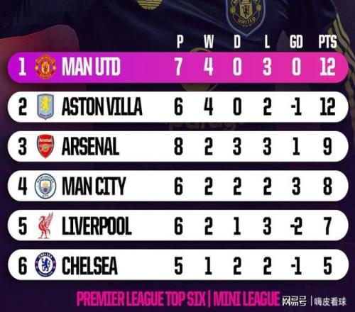 统计表明,英超积分榜前六名组成的小循环中,曼联7场得到12分,高居第一,阿森纳8场只有9分,强强对话的能力遭到质疑,阿斯顿维拉很不错,6场就拿到12分,是排名很高的重要因素。从另外一个角度看,曼联面对非前六名的球队,16场只得26分,场均只有1.63分,比强强对话的场均1.71分还要低。